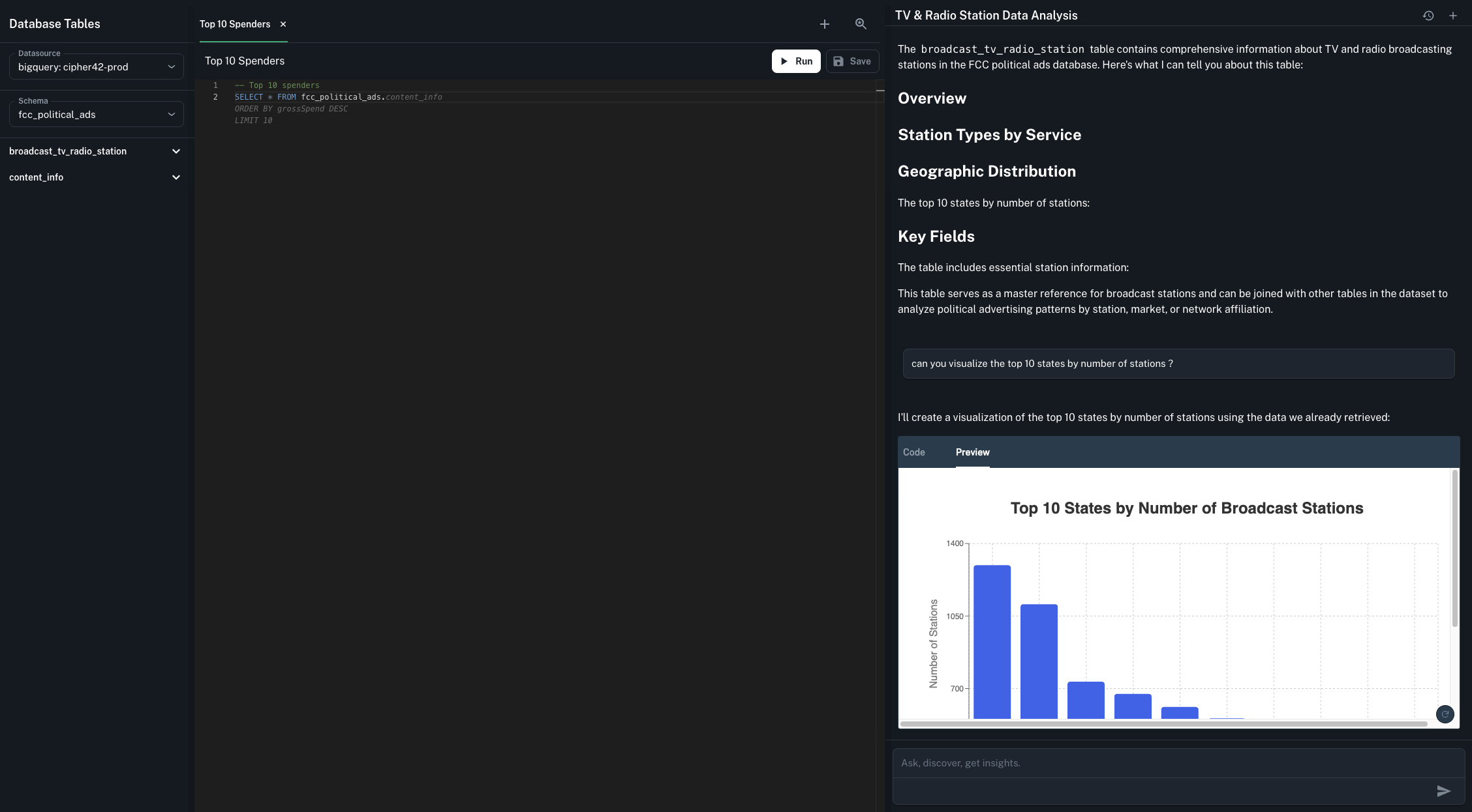 The chat has deep context to your schema (which is indexed for fast retrival once you add a datasource), previous run queries and other key metadata.Tool Use